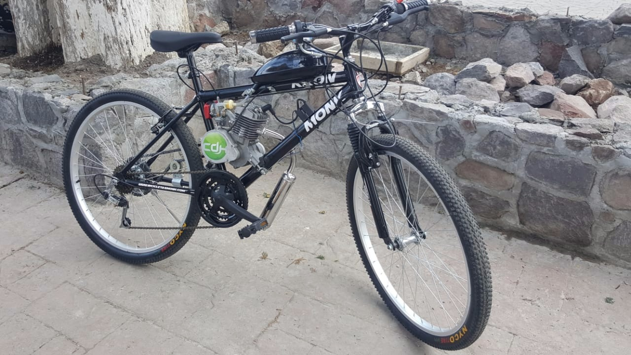 Suspensión delantera cuadro de acero aluminio reforzado llantas 26 urbanas; Tanque de dos litros (recorre aprox. 80Km); Motor de 80cc; Sprock de 34 T Velocidad promedio 52 Km x hr.